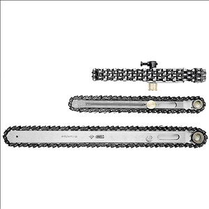 Die Fräsgarnitur für den Kettenstemmer eignet sich zur Herstellung von Zapfenlöchern für klassische Zapfenverbindungen im Holzbau. Die Garnitur besteht aus einer Fräskette, einem Führungschwert mit Fettbüchse zur Schmierung und einem passenden Kettenrad.