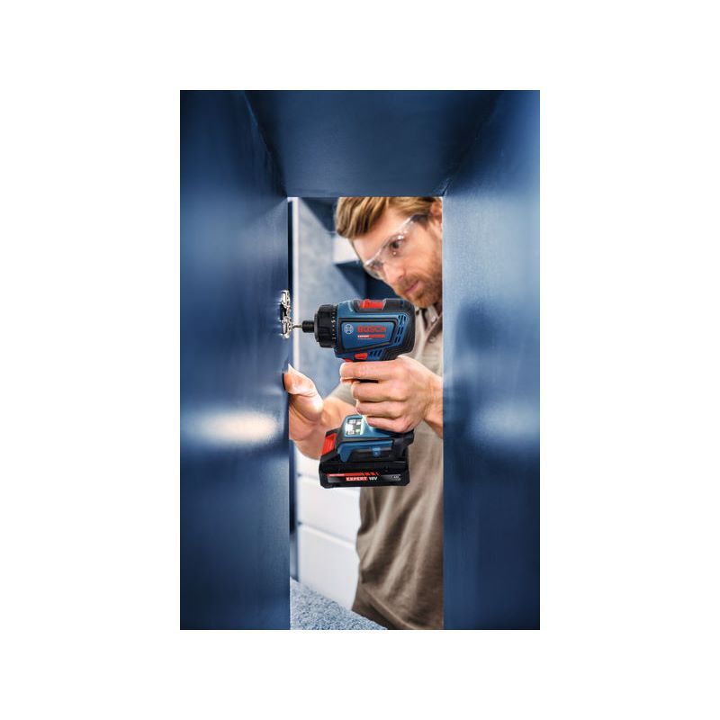 Akku-Bohrschrauber EXSR18V-90FC, Der kraftvolle EXPERT EXSR18V-90FC bietet 6-in-1-Flexibilität dank einfach zu wechselnder Aufsätze zum Bohren und Schrauben. Er gehört zum vielseitigen Bosch Professional FlexiClick-System, mit dem eine Vielzahl von Herausforderungen auf der Baustelle gemeistert werden können. Der einzigartige Hammeraufsatz GFA 18-H verwandelt das Werkzeug in einen SDS plus-Bohrhammer, der zum Hammerbohren in Beton bis zu einem Durchmesser von 10 mm verwendet werden kann. Das Werkzeug ist mit fortschrittlichen Schutzfunktionen ausgestattet: KickBack Control minimiert das Verletzungsrisiko bei blockierendem Bohrer. Precision Clutch stoppt das Überrasten, sobald ein vorgegebenes Drehmoment erreicht wird. Beide Funktionen können ein- und ausgeschaltet werden. Mit FlexiClick kannst du die Menge der Ausrüstung reduzieren, die du auf Baustellen mitnehmen musst. FlexiClick-Aufsätze können für gelegentliche Anwendungsfälle eigens dafür vorgesehene Werkzeuge ersetzen. Das Bosch Professional FlexiClick System – perfekt gerüstet für professionelle Arbeiten. Er ist perfekt für alle Schraub- und Bohrarbeiten in Holz, Metall und (kombiniert mit dem GFA 18-H) in Beton, Mauerwerk und Stein. Kompatibel mit dem Bosch Professional 18V-System und mit der markenübergreifenden AMPShare-Akku-Allianz. Weitere Anwendungen: Mit dem Exzenter-Aufsatz kannst du nahe an Kanten und Wänden arbeiten, während der Winkelaufsatz den Bohrschrauber in einen Winkelschrauber verwandelt. Diese Aufsätze können in einem 360°-Winkel in 16 verschiedenen Positionen arretiert werden, ohne dass sie vom Werkzeug enternt werden müssen. Mit einer Kopflänge von nur 136 mm und einem max. harten Drehmoment von 65 Nm hast du ein äußerst kompaktes und leistungsstarkes Werkzeug zur Hand. Metallbohrfutteraufsatz für Bohrfutter GFA 18-M Professional (1 600 A01 3P6); Winkelaufsatz GFA 18-W Professional (1 600 A01 3P7); Exzenteraufsatz GFA 18-E Professional (1 600 A00 1SJ); Einlage für L-BOXX 136; L-BOXX 136 (1 600 A01 2G0)