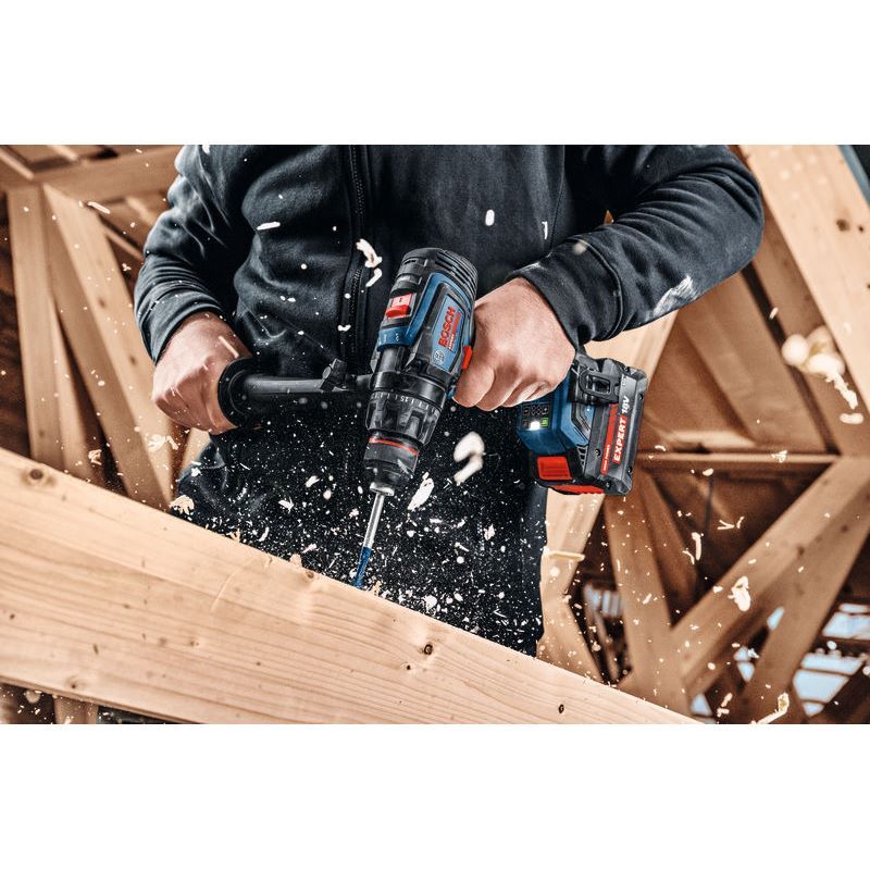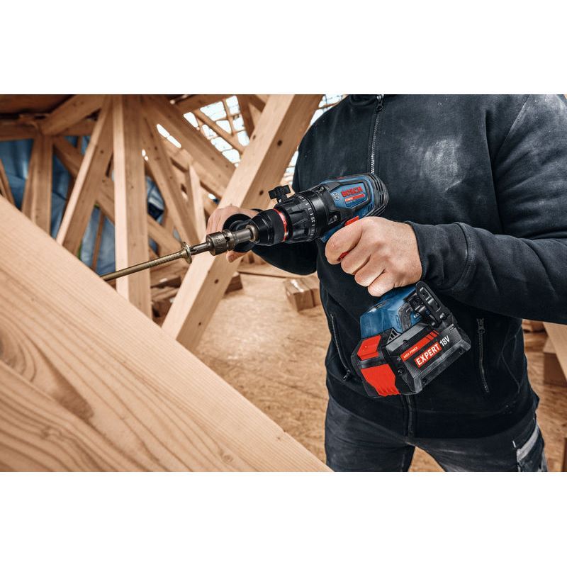 Akku-Schlagbohrschrauber EXSB18V-150, Der EXPERT EXSB18V-150 ist der überragende Bohrschrauber mit einzigartiger Leistung und Kontrolle für verschiedenste Schraub- und Bohrarbeiten mit 30.000 bpm. Er ist die perfekte Wahl für extrem schnelle Arbeitsfortschritte dank eines bürstenlosen Motors mit BITURBO-Technologie, außergewöhnlich leistungsstarker EXPERT-Akkus und eines maximalen Drehmoments von 150 Nm. KickBack Control minimiert das Verletzungsrisiko bei blockierendem Bohrer. Diese Funktion kann ein- und ausgeschaltet werden. Präzise Electronic Angle Detection sorgt für den richtigen Winkel von langen Schrauben. Dank 13-mm-Metallbohrfutter und Metallgetriebe ist der Schlagbohrschrauber extrem zuverlässig und robust. Er besitzt einen Zusatzhandgriff, der mühelos auf jede Position eingestellt werden kann. Die schnelle Modusauswahl ermöglicht den einfachen Wechsel zwischen Bohren, Schlagbohren und Schrauben. Der EXPERT EXSB18V-150 liefert optimale Ergebnisse beim Bohren und Schrauben in Holz, Mauerwerk oder Metall, speziell bei großen Durchmessern, z. B. Lochsägen bis zu 150 mm. Kompatibel mit dem Bosch Professional 18V-System und mit der markenübergreifenden AMPShare-Akkuplattform. Zusatzhandgriff; Einlage für L-BOXX 136; L-BOXX 136 (1 600 A01 2G0)